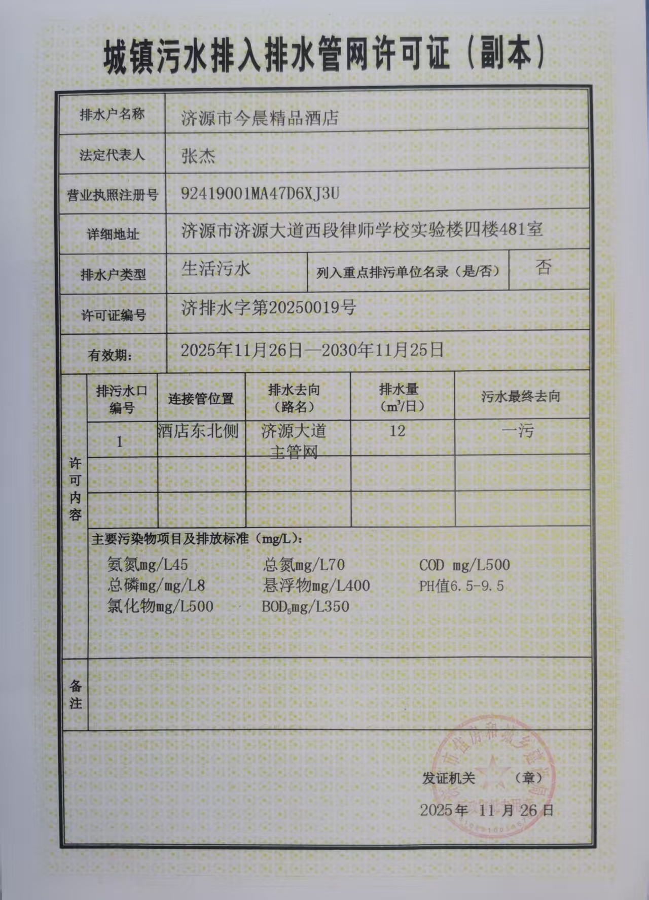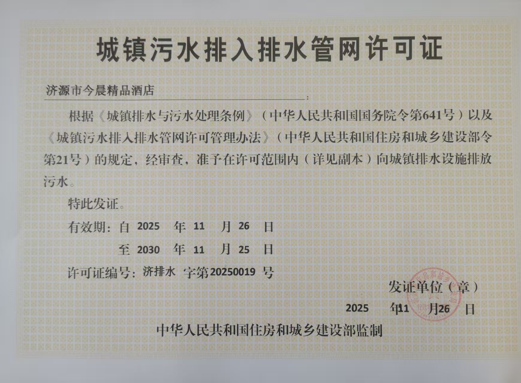 济源市今晨精品酒店城镇污水排入排水官网许可