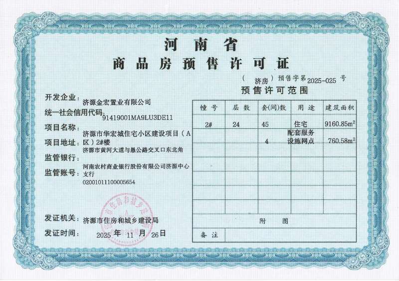 济源市华宏城住宅小区建设项目(A区)2#楼商品房预售许可证