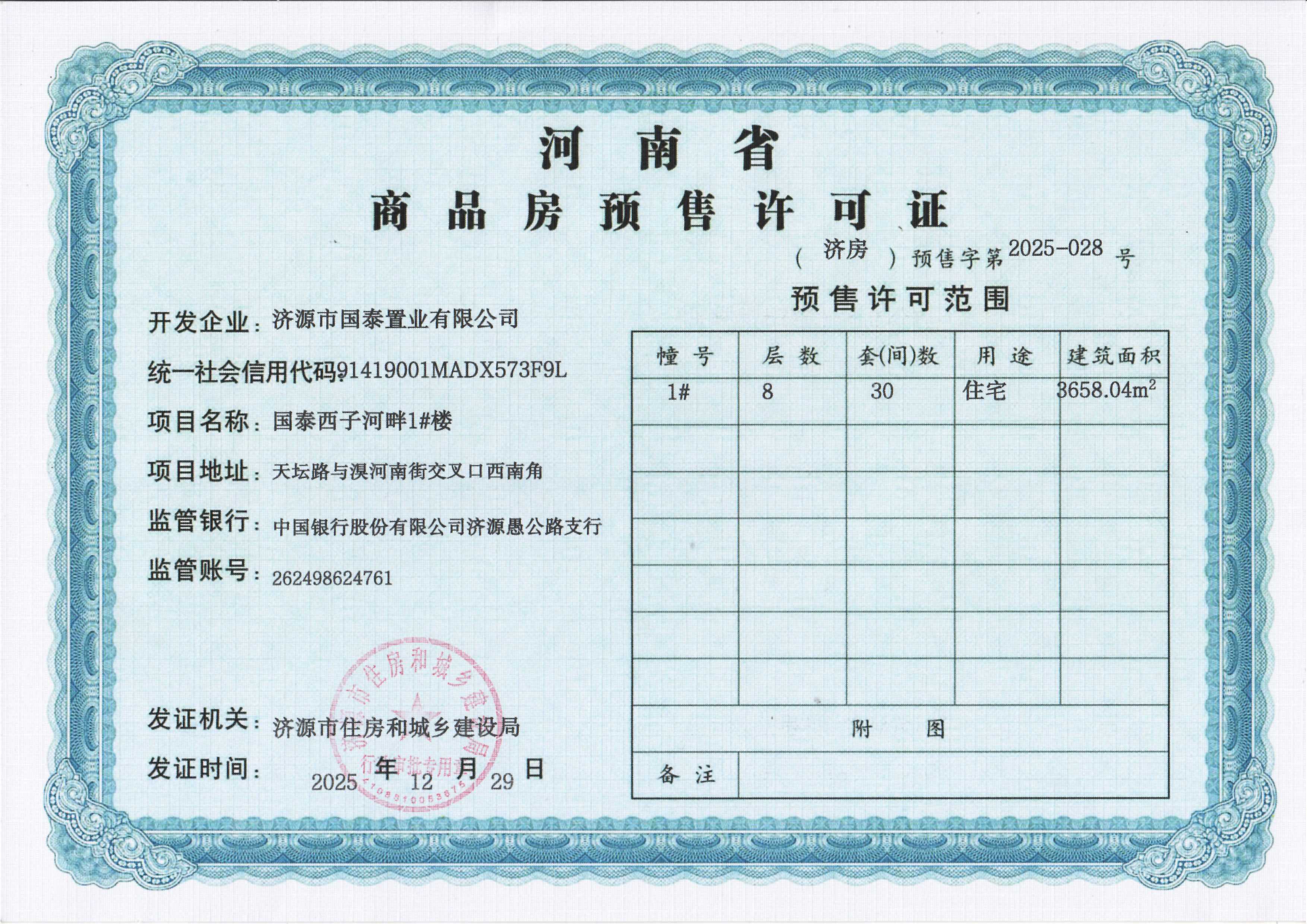 国泰西子河畔1#楼商品房预售许可证