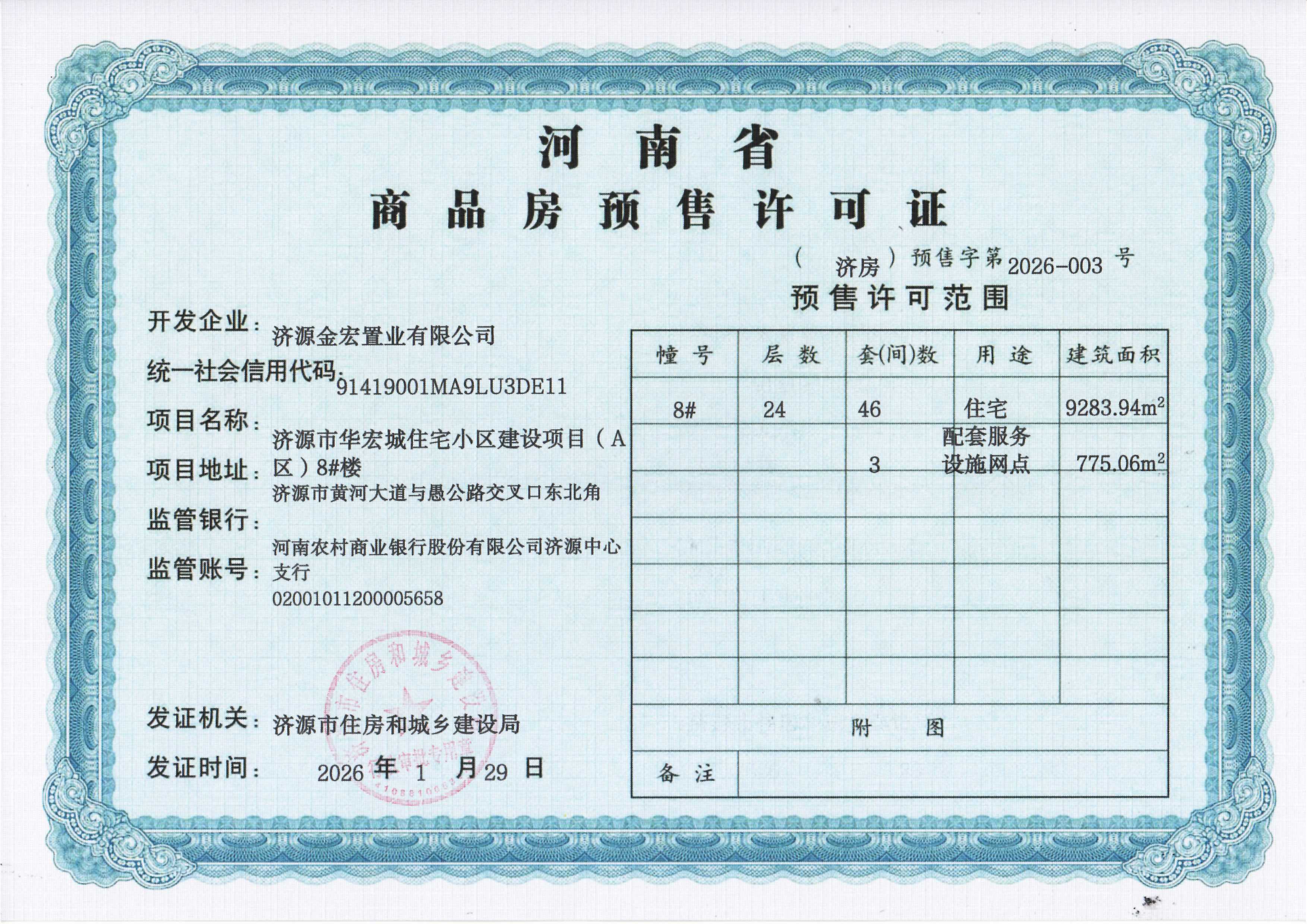 济源市华宏城住宅小区建设项目A区8#楼商品房预售许可