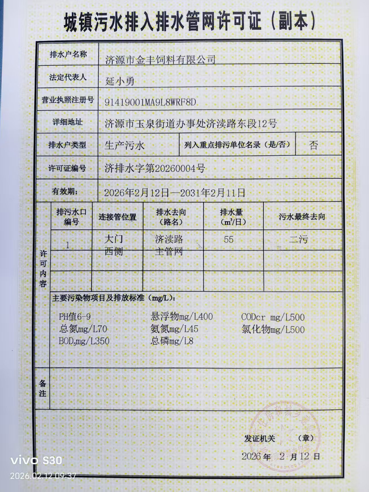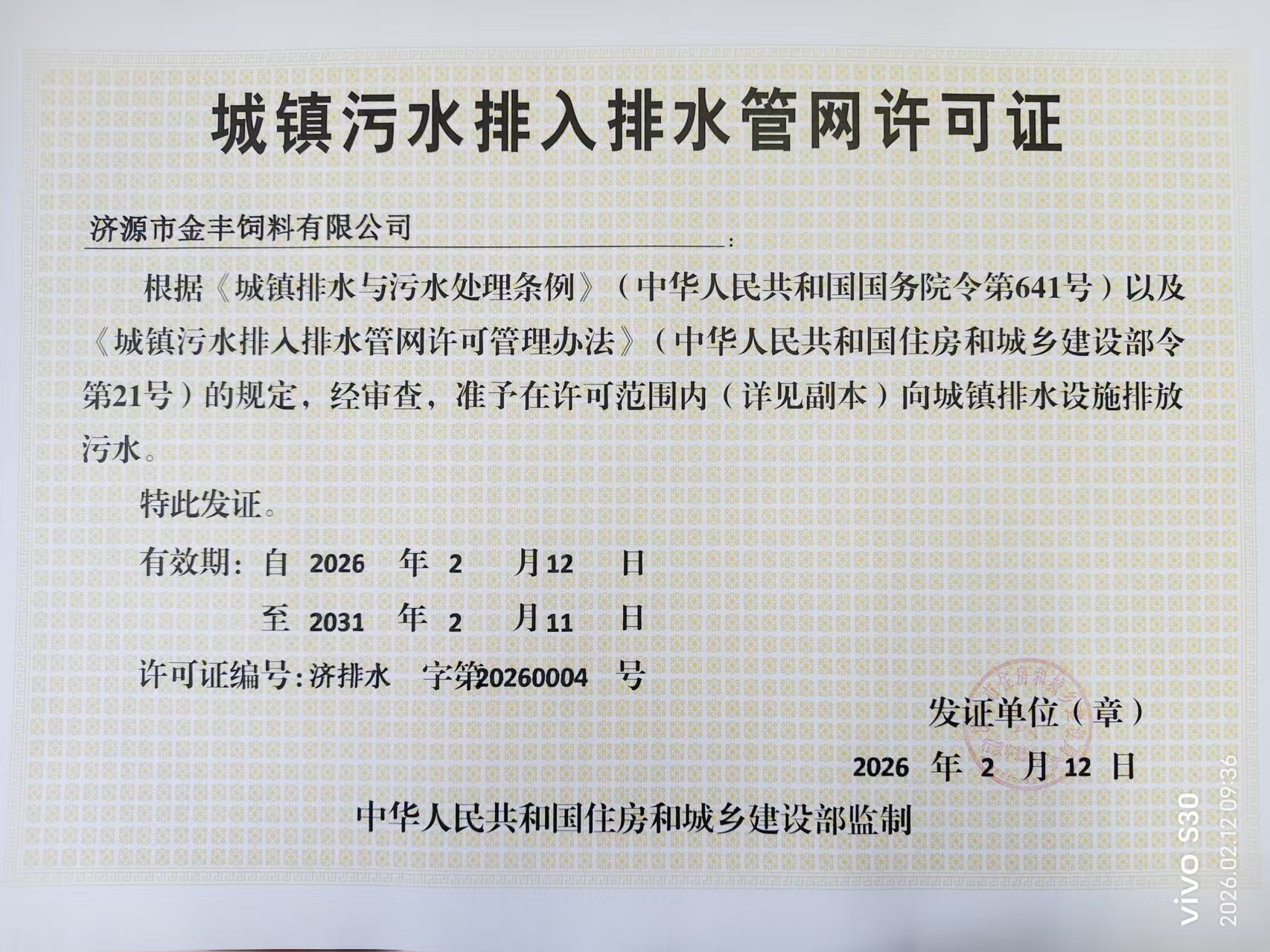 济源市金丰饲料有限公司城镇污水排入排水管网许可证