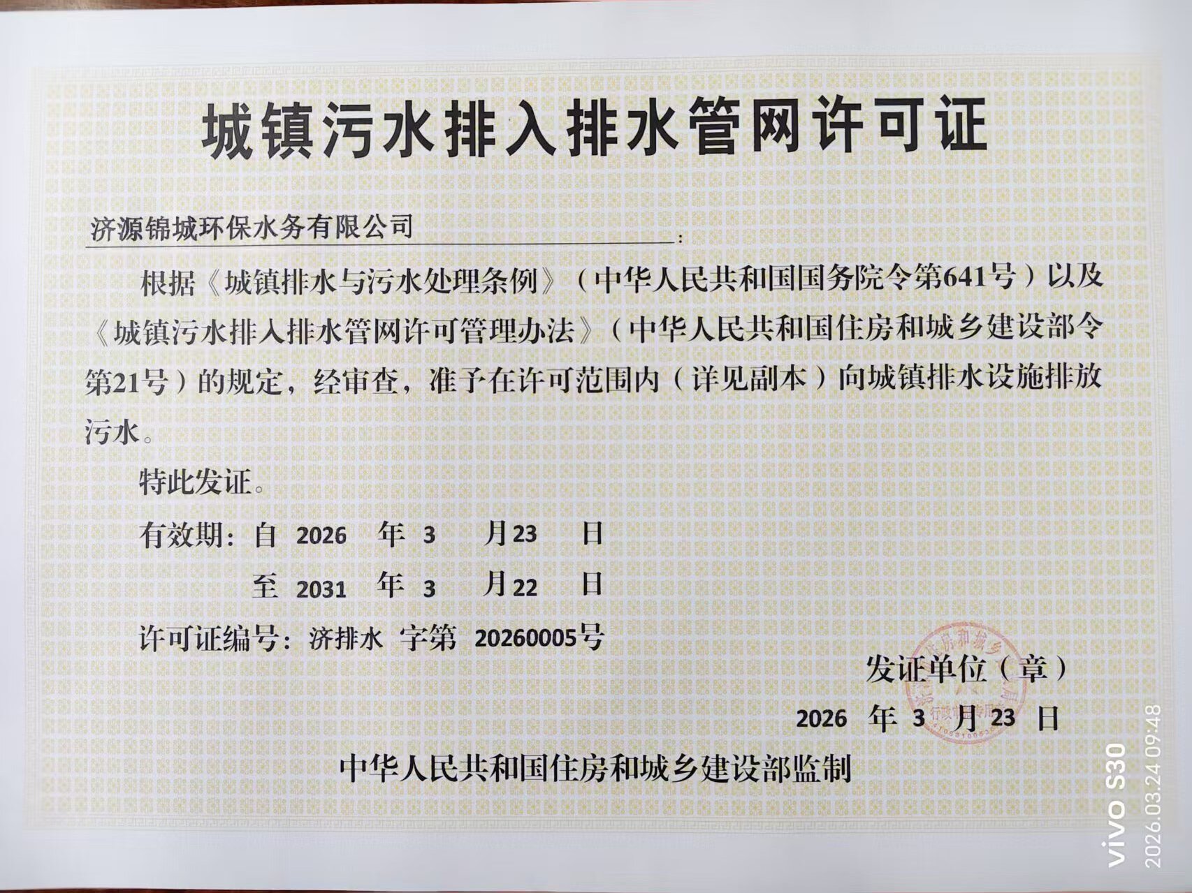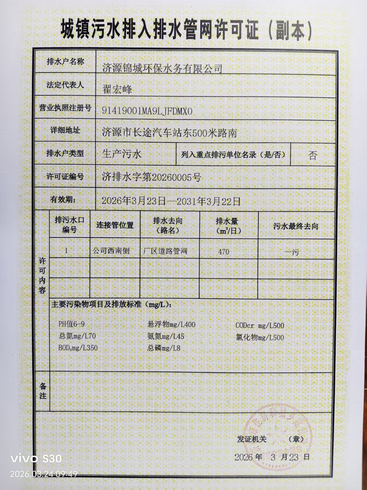 济源锦城环保水务有限公司城镇污水排入排水管网许可证