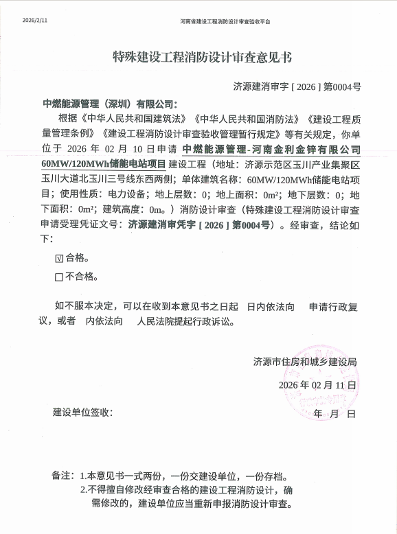 中燃能源管理-河南金利金锌有限公司60MW/120MWh储能电站项目特殊建设工程消防设计审查意见书