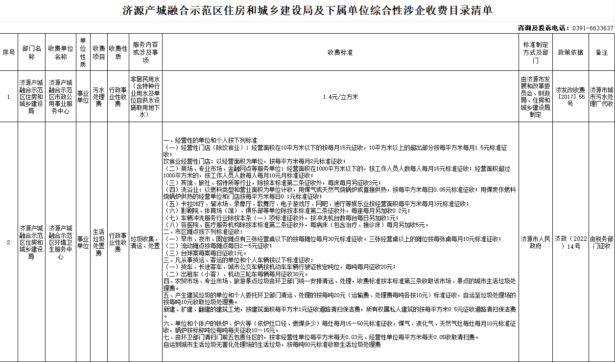 关于公布济源产城融合示范区住房和城乡建设局及下属单位综合性涉企收费目录清单的公告